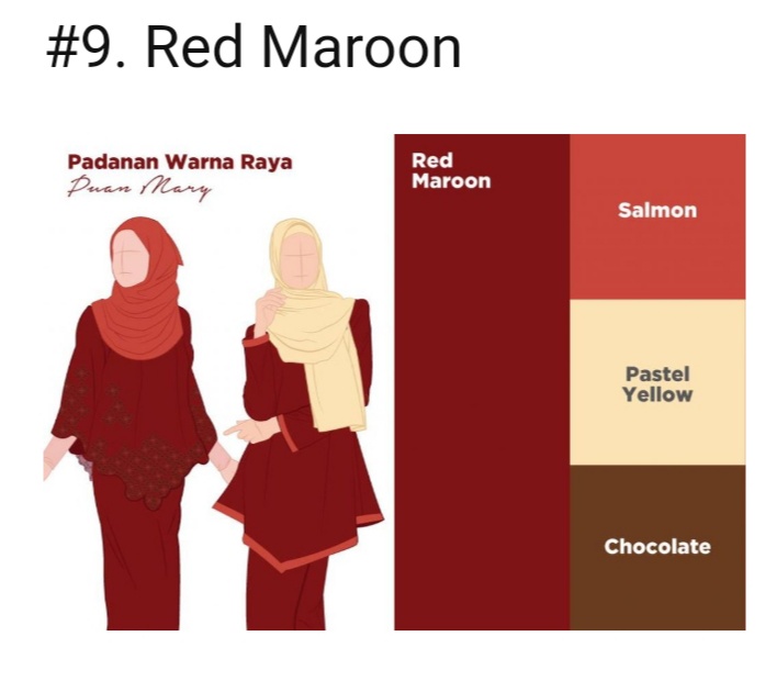 Panduan matching warna baju dan tudung matching atau padankan tudung dan baju ni similar dengan orang perempuan. Lelaki jarang la matching matching ni. Setiap kali menjelang keraian dan perayaan customer mesej kak fa bertanyakan warna tudung yang sesuai untuk baju raya dorang. Warna maroon juga dikenali sebagai warna merah antara warna menjadi tarikan bagi wanita pemakaian tudung yang sesuai menyerlahkan lagi si pemakainya.