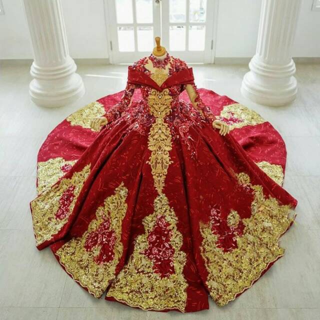 Gaun Pengantin Request Customer Merah Gold Ekor Bonus Kerudung